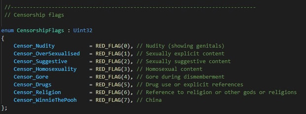 Listalta silmiinpistävänä nousee etenkin WinnieThePooh-nimen saanut muuttuja, jolla peli sensuroidaan Kiinan markkinoita varten. Nalle Puh -hahmoon viittaava nimi on Kiinassa kyseenalainen, sillä hahmoa on käytetty ivallisena viittauksena Kiinan presidentti Xi Jinpingiin. Nalle Puh -viittaukset ovat johtaneet aikaisemmin ongelmiin pelialalla. Esimerkiksi taiwanilaisen Red Candle Gamesin Devotion-kauhupeli oli reilun kahden vuoden ajan pois myynnistä pelin rinnastettua Xi Jinpingin ja Nalle Puhin peliin piilotetussa kuvassa.