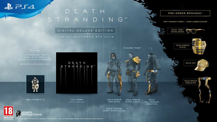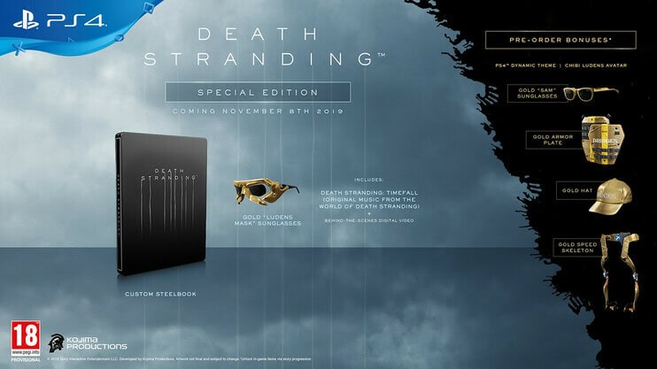 Kauppoihin Death Stranding tuodaan peräti kolmen erilaisen erikoisversion voimin. Ennakkotilaajille luvassa on myös kultaisia kosmeettisia esineitä.
