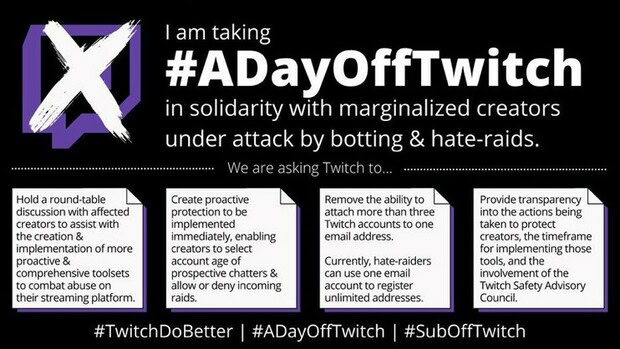 #ADayOffTwitch-protesti järjestettiin vastalauseena alustan kyvyttömyyteen puuttua viime aikoina yltyneisiin vihahyökkäyksiin, jotka ovat kohdistuneet vähemmistöryhmiin kuuluviin sisällöntuottajiin. Erilaisilla solvauksilla ja loukkaavalla kielenkäytöllä suoratoistojen keskusteluita täyttäviä botteja ja katsojia ei ole saatu aisoihin. Iso joukko striimaajia, mukaan lukien Kaceytron ja HasanAbi, jättivät yhden päivän väliin Twitchissä osoittaakseen tukensa.