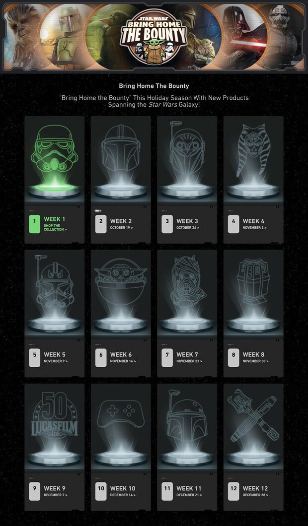 Viihdejätti polkaisi hiljattain käyntiin 12-viikkoisen markkinointikampanjan, jonka puitteissa paljastetaan viikoittain uusia Tähtien sota -aiheisia tuotteita. Kampanjaa on takana vasta viikko, mutta faneille on jo vilautettu tulevia julkistuksia pohjustavaa kalenteria, jossa jokaiselle viikolle on omistettu oma ikoninsa Boba Fettin kypärästä Lucasfilm-logoon. Tiistai 14. joulukuuta on merkitty peliohjaimella, mikä viitannee videopeliaiheiseen paljastukseen.