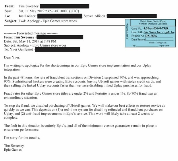 Sweeney kertoo anteeksipyynnössään The Division 2:een liittyvien petosostojen osuuden ylittäneen kahden vuorokauden aikana 70 prosenttia, kun muiden pelien kohdalla epärehellisiä ostoja tehtiin alle 2 prosentissa tapauksista. Sweeneyn sähköpostiviestin mukaan Epic otti täyden vastuun ongelmasta ja takasi Ubisoftille myös sopimusten mukaiset osuudet pelien myynneistä.