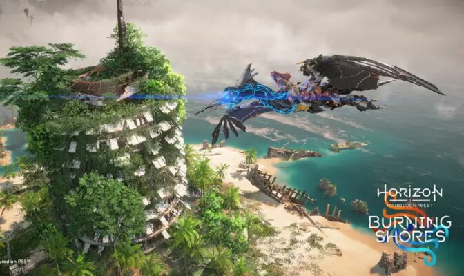 Horizon Forbidden West -pelaajat pääsevät käsiksi Burning Shoresiin PS5-konsoleillaan 19. huhtikuuta 2023.