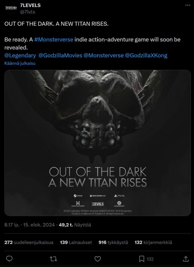 7Levelsin sosiaalisessa mediassa julkaisemassa kuvassa näkyy muinaisen olennon luuranko pelin ”Out of the Dark A New Titan Rises” – tunnuslauseen kera. Julkaisuun on myös merkitty Legendary Picturesin ja Monsterverse-elokuvien viralliset tilit, mikä vahvistaa, että peli sijoittuu elokuvien kanssa samaan universumiin.