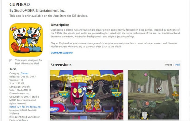 Mobiilisovelluskauppojen synkempi puoli on nostanut taas päätään näin alkuviikosta. Maanantaina Applen App Storessa kummastusta alkoi herättää sinne yllättäen ilmestynyt versio Cupheadista, jota myytiin pelin tehneen StudioMDHR:n nimellä noin viidella eurolla sitä mukailevien ruutukaappauksien ja tuotekuvausten voimin.