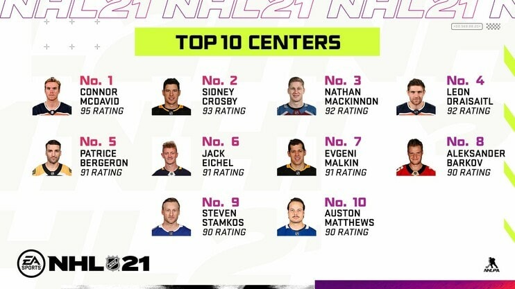 NHL 21:n parhaimmaksi pelaajaksi EA on nostanut jälleen kerran Edmonton Oilersin kanadalaissentteri Connor McDavidin, joka pitää paikkaa hallussaan yleistaitoluokituksella 95. Ensimmäinen suomalainen tulee listalla vastaan sijalla 20, jota pitää hallussaan Florida Panthersin Aleksander Barkov 90 pisteen yleisluokituksella. Viidenkymmenen kärjen muut suomalaoset ovat sijalta 22 löytyvä Mikko Rantanen (90), sijalla 25 oleva Tuukka Rask (90) ja sijalla 42 luisteleva Sebastian Aho (88).
