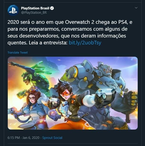 PlayStationin brasilialaisella Twitter-tilillä julkaistu viesti kertoi Overwatch 2:n ilmestyvän PS4:lle kuluvana vuonna. Twiitti poistettiin jonkin aikaa julkaisun jälkeen, mutta sisältö jäi elämään alla nähtävän kuvakaappauksen muodossa ja on näin kiinnittänyt huomiota netissä.