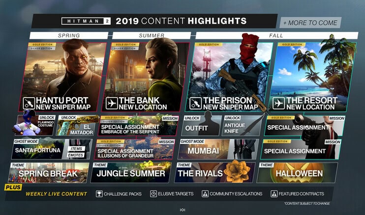 IO Interactive on tarjoillut selkeämmän kuvan Hitman 2:n sisältötulevaisuudesta. Uusi kaavio vahvistaa, mitä kaikkea on luvassa peliin aina syvälle syksyyn asti.