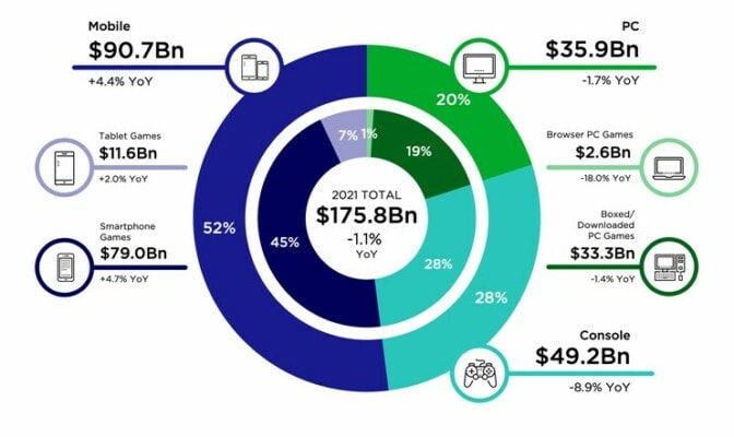Newzoon ennusteiden mukaan pelimarkkinoiden liikevaihto vuonna 2021 päätyy 175,8 miljardiin dollariin. Luku on poikkeuksellisesti 1,1 prosentin laskussa edellisvuoden 177,8 miljardin dollarin ennätyslukemista. Newzoon mukaan markkinoiden supistuminen ei kuitenkaan aiheuta syytä pitkäaikaiseen huoleen, sillä globaalien pelimarkkinoiden ennustetaan edelleen ylittävän 200 miljardin dollarin liikevaihdon vuoteen 2023 mennessä.