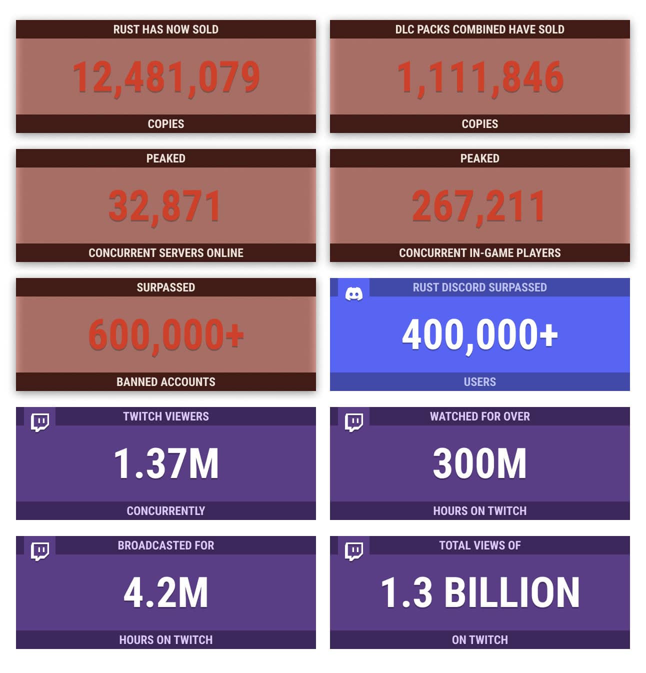 Myös muita tilastotietoja on tuuleteltu. Parhaimmillaan Rustin raportoidaan kerryttäneen samanaikaisia pelaajia 267 211 selviytyjän edestä, kun taas bannattuja pelaajia on kertynyt reilut 600 000. Peli on suosittu Twitchissäkin, jossa sen kerrotaan saavuttaneen viime vuonna parhaimmillaan 1,37 miljoonaa samanaikaista katsojaa sekä katsojakertoja kokonaisuudessaan 1,3 miljardia.