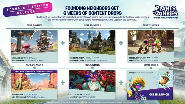 EA ja PopCap kokeilevat Battle for Neighborvillella hieman erilaisempaa julkaisustrategiaa. Sen varsinainen lanseeraus tapahtuu 18. lokakuuta Xbox Onella, PlayStation 4:llä ja pc:llä. Jo nyt siitä tarjoillaan kuitenkin Founder’s Editioniksi kutsuttua 30 euron varhaisversiota, johon lisätään seuraavan kuuden viikon aikana koko ajan vähitellen lisää pelattavaa pienin lisäpalkinnoin.