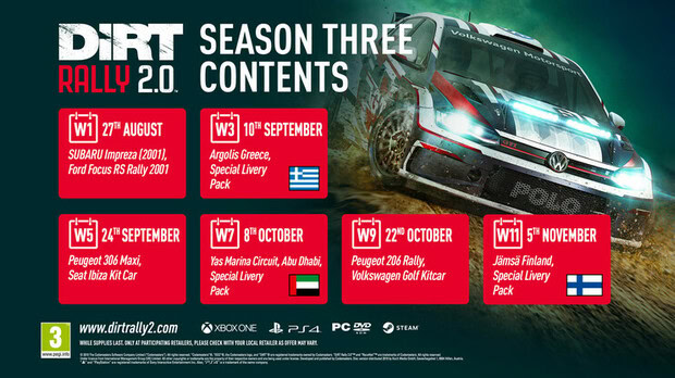 Sisältökausista ensimmäinen käynnistyy 27. elokuuta, jolloin peliin tuodaan hankittavaksi lisäautot Subaru Impreza ja Ford Focus RS Rally 2001. Syyskuun 10. päivä näitä seuraavat aiemmin jo ensimmäisestä Dirt Rallysta tuttu Kreikan ajokohde, joka saa 8. lokakuuta seuraa Yas Marina -motocrossradasta. Lopulta 5. marraskuuta myöskin edellisessä Dirt Rallyssa nähty Jämsä liittyy mukaan.